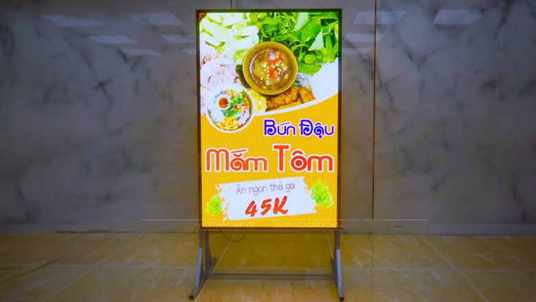 Di động và linh hoạt: Biển quảng cáo đứng có kích thước nhỏ gọn, dễ dàng di chuyển và đặt ở bất kỳ vị trí nào phù hợp nhất để thu hút sự chú ý của khách hàng. Bạn có thể thêm bánh xe để di chuyển biển hiệu một cách dễ dàng.