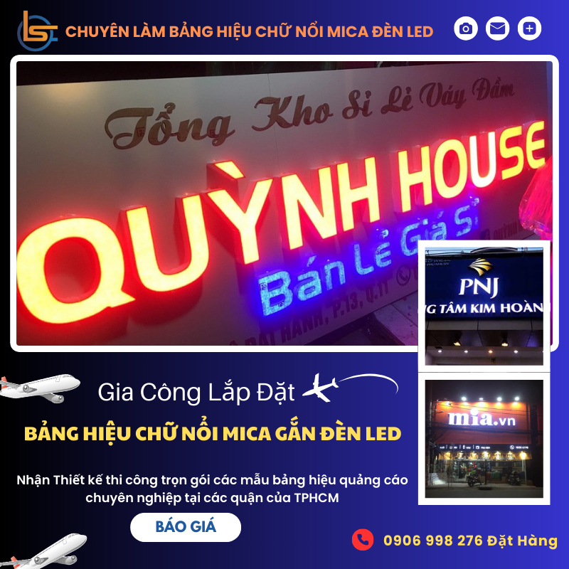 Chúng tôi là đơn vị chuyên thiết kế và thi công làm bảng hiệu quảng cáo chữ nổi các loại về mica và alu cho mẫu  trong nhà và ngoài trời tại khu vực thành phố hồ chí minh. Khi quý khách có nhu cầu làm bảng hiệu hãy gọi điện