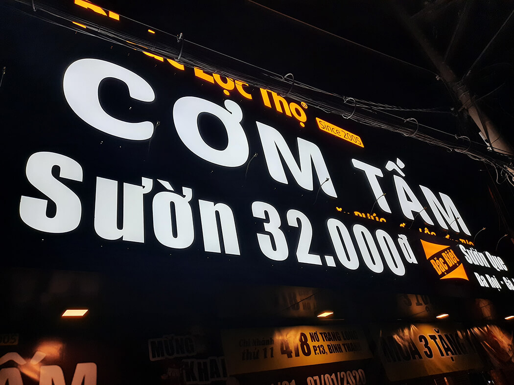 Trước đây đèn led được dùng nhiều cho quán cà phê, nhà hàng,… Thế nhưng, cơm tấm hiện nay cũng sử dụng loại đèn này rất nhiều. Đặc biệt là quán cơm phục vụ buổi tối. Đèn lead tạo ra màu sắc đa dạng, nổi bật thu hút sự quan tâm của thực khách từ xa.