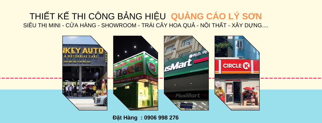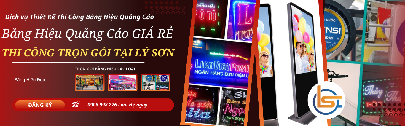 Bảng hiệu quảng cáo tại Lý Sơn là những tấm bảng quảng cáo được ghi đầy đủ về các thông tin, hình ảnh, địa chỉ, tên doanh nghiệp… được gắn bên ngoài cửa hàng, trước cổng công ty với muôn vàn kiểu dáng, kích thước đa dạng khác nhau. Chúng được thiết kế bắt mắt, sáng tạo và ấn tượng từ nhiều chất liệu nhằm mục đích gây sự thu hút người nhìn cũng như giúp truyền tải quảng bá doanh nghiệp một cách nhanh chóng và hiệu quả nhất.
