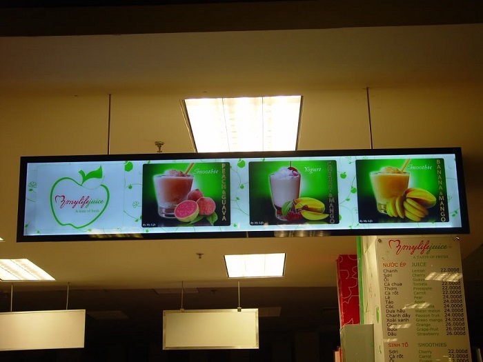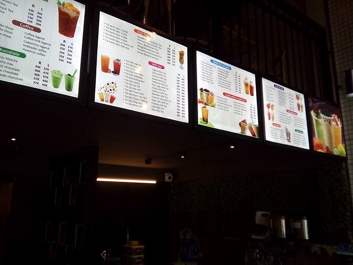 Ngoài chức năng quảng cáo, hộp đèn siêu mỏng còn được sử dụng hiển thị giá menu, hiển thị nội dung món ăn giúp khách hang dễ dàng gọi món.